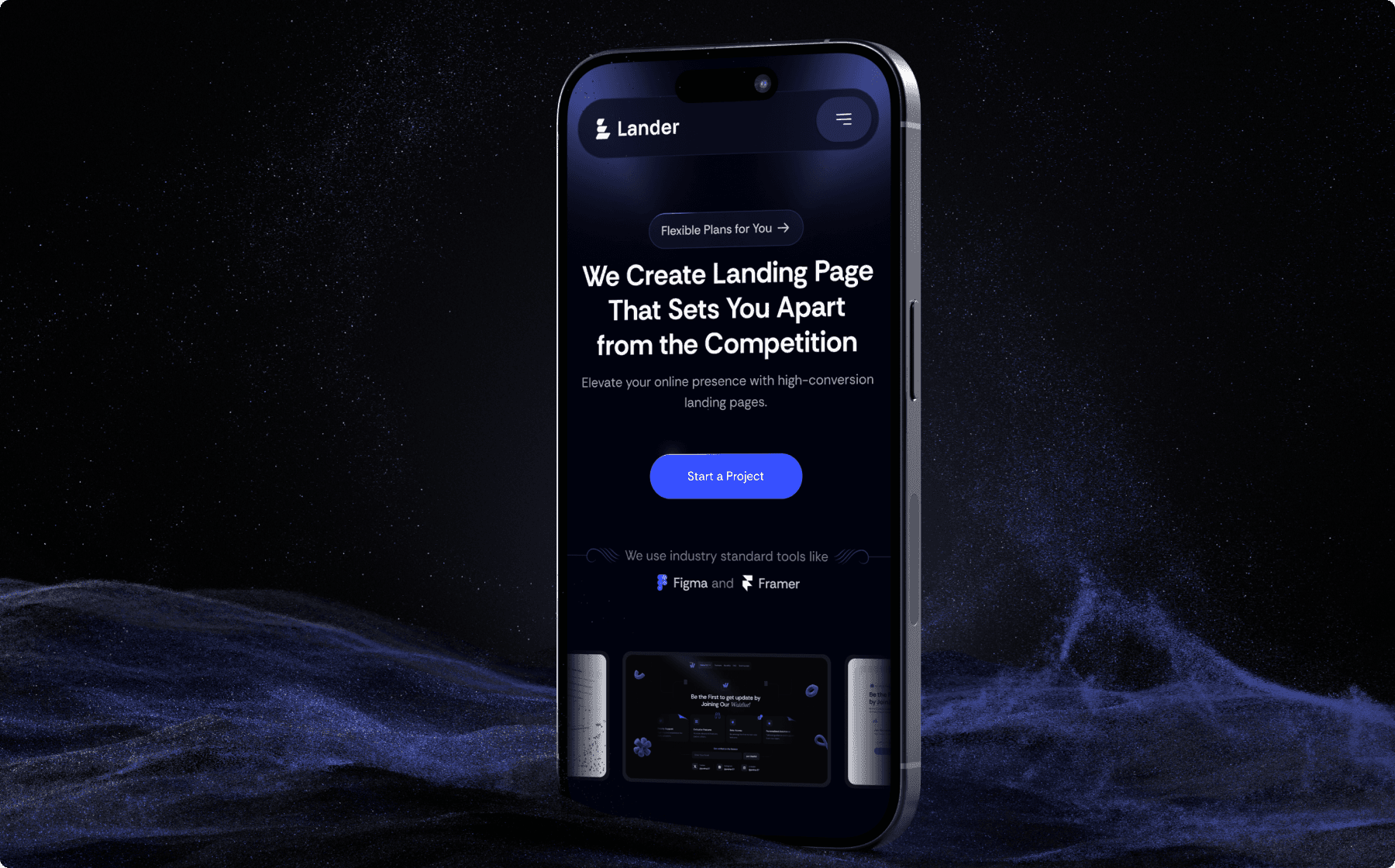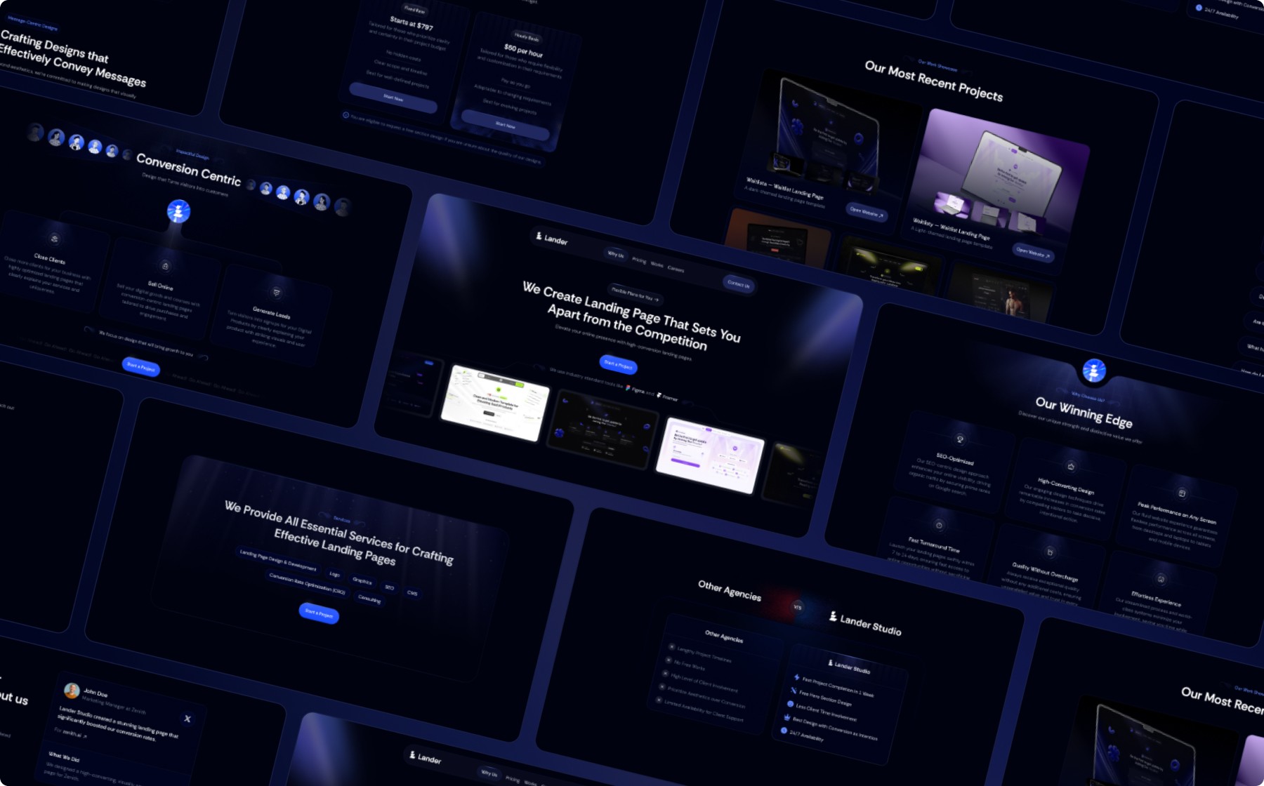 Lander is a sleek, dark blue-themed landing page template designed for agencies. It combines modern aesthetics with high functionality to showcase your brand's services and drive conversions effectively.